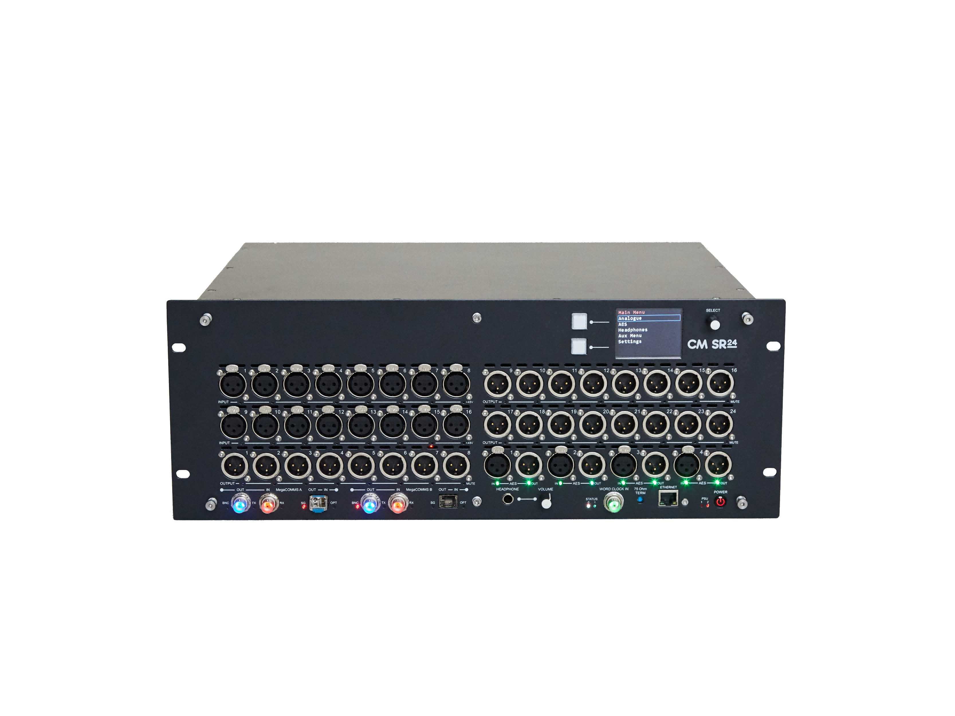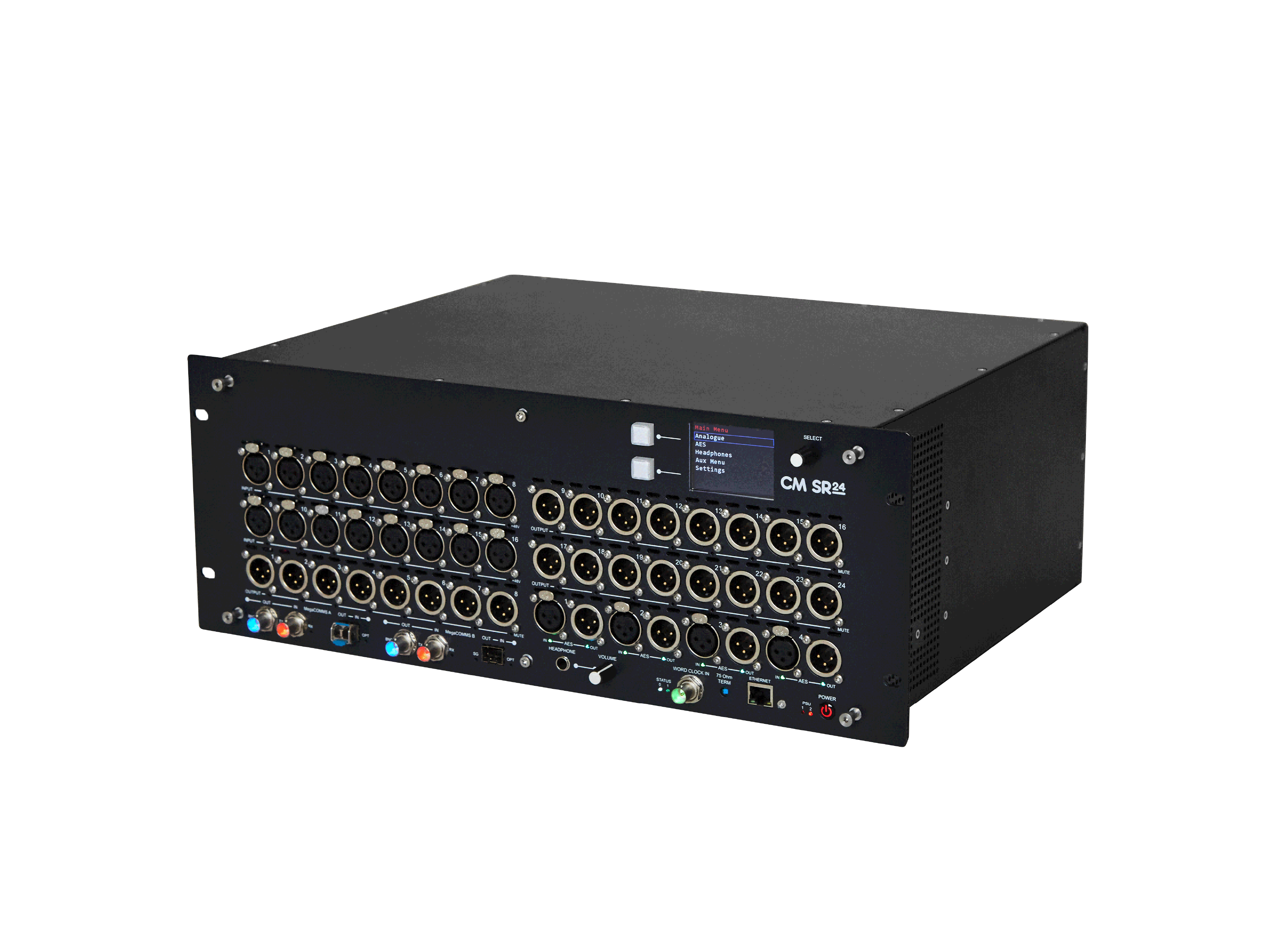 CM-SR24 is a product with two 4U height stage boxes,equipped with 16 analog inputs and 24 analog outputs, as well as 8 AES3 inputs and 8 AES3 outputs. The 2.4" color LCD displays a comprehensive menu structure, and allows for setting locally to adjust input levels, microphone gain, and phantom power. The integrated preamplifier enhances usability, saves time, and can monitor audio directly on the stage rack.